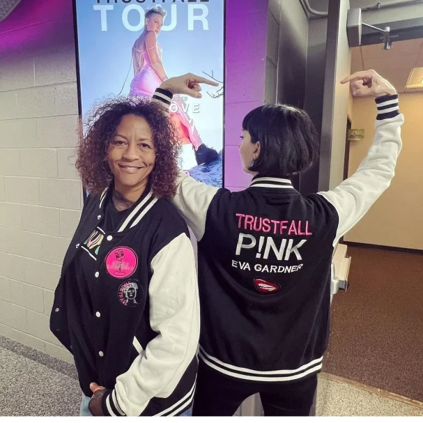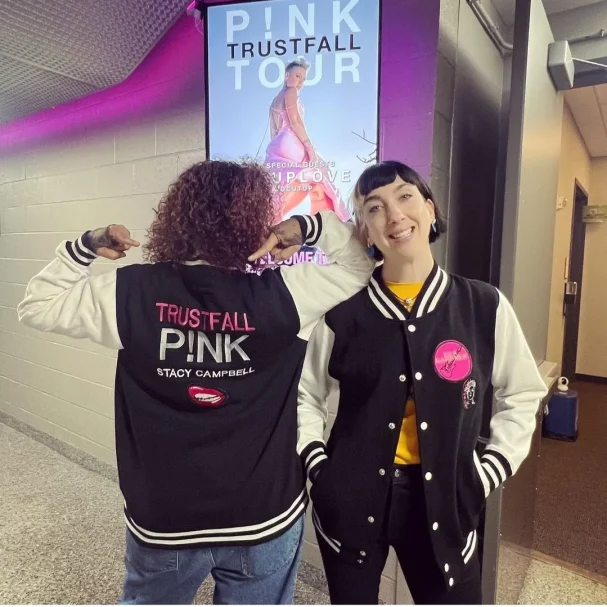 Für mich als Pink-Fan war das natürlich ein absolutes Highlight. Ich besuche schon seit Jahren nahezu jedes Konzert der US-amerikanischen Sängerin und ihrer Band und gehöre zu den Groupies in der ersten Reihe. Mittlerweile kenne ich auch viele Band-Mitglieder persönlich. Zunächst habe ich nur College-Jacken für Freunde mit Motiven zur Trustfall-Tour bestickt und die Teile mit ihrem jeweiligen Namen personalisiert. Irgendwann wurde dann auch einige Leute aus der Pink-Crew darauf aufmerksam und fragten an, ob ich so was auch für sie machen könnte. Eva Gardner (Bass und Vocals), Stacey Campbell (Vocals) und Brad Comfort (Video Editor) beispielsweise tragen passend zur Trustfall-Tour 2023 eine von mir bestickte individualisierte College-Jacke. Jetzt warte ich nur noch darauf, dass Pink die Jacke, die ihr im erwähnten Video in meinem Namen überreicht wurde, bei einem ihrer nächsten Konzerte trägt. Aktuell habe ich auf Basis eines von mir gemachten Fotos von Pink auch einen Siebdruck angefertigt und auf T-Shirts übertragen. Vielleicht bekommt sie eines dieser Shirts, wenn ich ihr beim nächste Konzert gegenüberstehe.